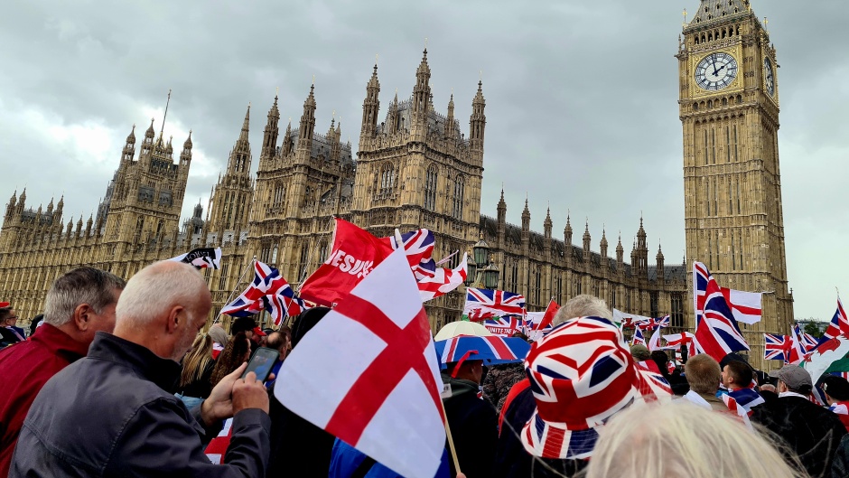 The rally, held in the name of 'free speech' and 'British identity', included protesters dressed as crusaders, carrying large wooden crosses and flags with images and messages of Jesus.