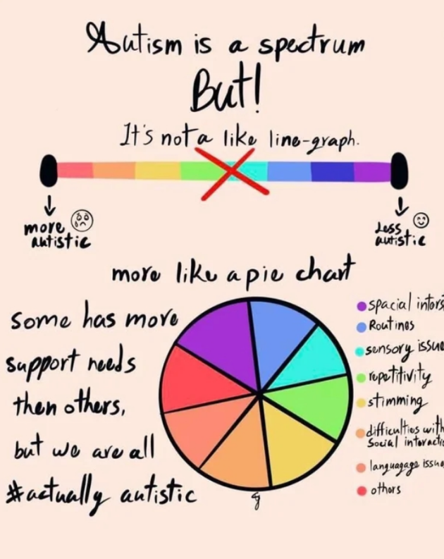 7. “Child ‘A’ has ‘severe Autism’ and Child ‘B’ has ‘mild Autism’.” Terms like ‘mild’ or ‘severe’, ‘high-functioning’ or ‘low-functioning’, are not helpful when describing an Autistic child or young person. Each child is different and may have a range of other factors affecting them, for example learning disabilities or long-term health conditions. Even the Autism ‘spectrum’ can have its issues, see the helpful image below this list from r/autism (https://www.reddit.com/r/autism/)
