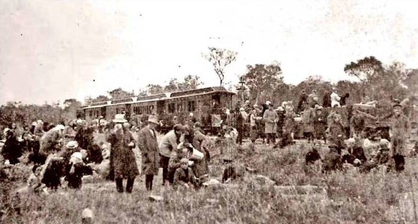 [photo_footer] Arrival of the Mennonites by train from Puerto Casado to Km. 145. / Fernheim Archive.[/photo_footer]